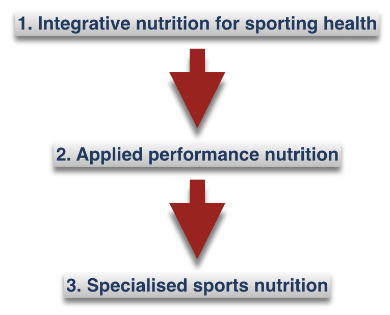 As shown in the following flow chart, the course is a progressive learning experience, starting with a comprehensive study of integrative (or functional) nutrition within a sporting context, then moving through conventional sports nutrition with a strong integrative slant to it, and finishing with a very specialised module which looks at cutting edge strategies within sports nutrition and particular sports themselves.